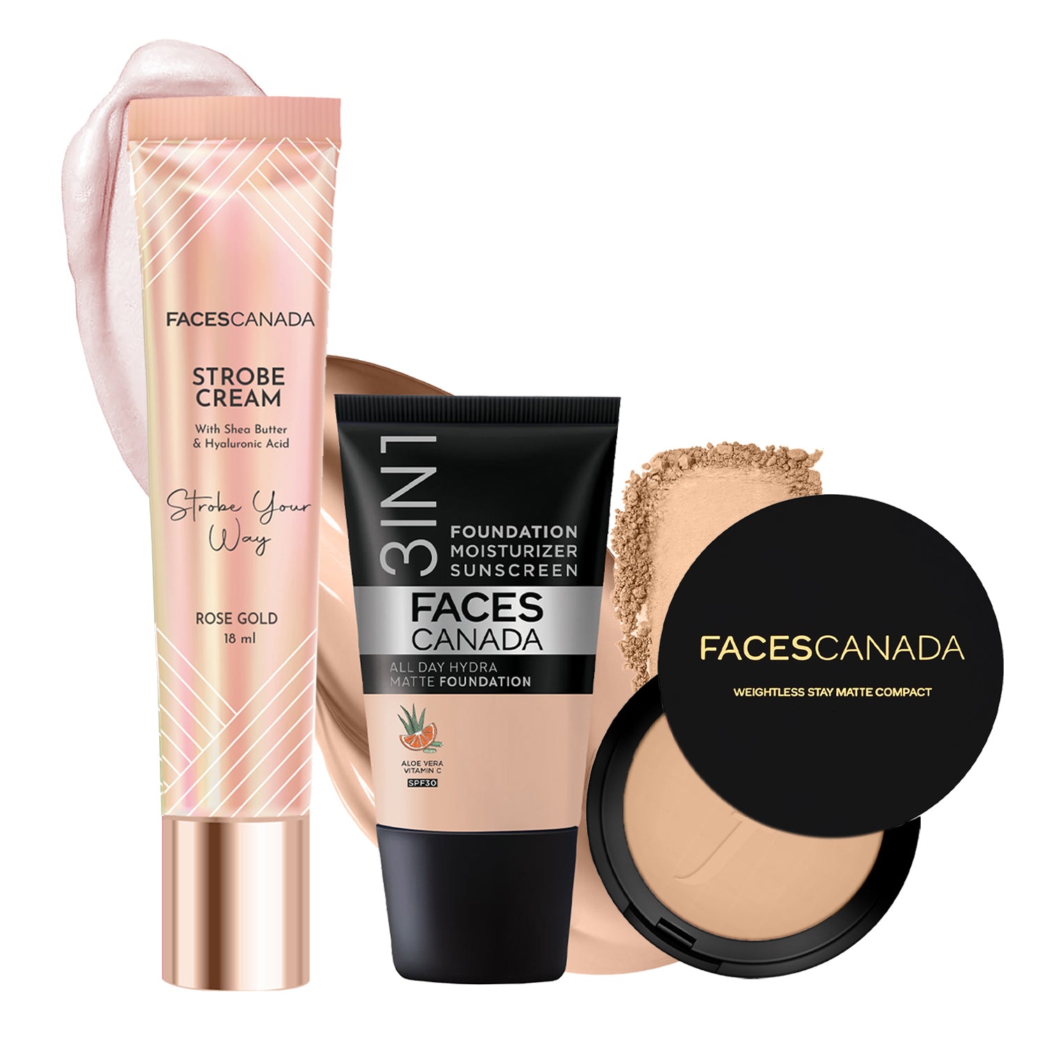All Day Glam Combo - Mini Rose Gold Strobe Cream + Compact Beige + Hydra Matte Foundation (Mini) - (18ml)