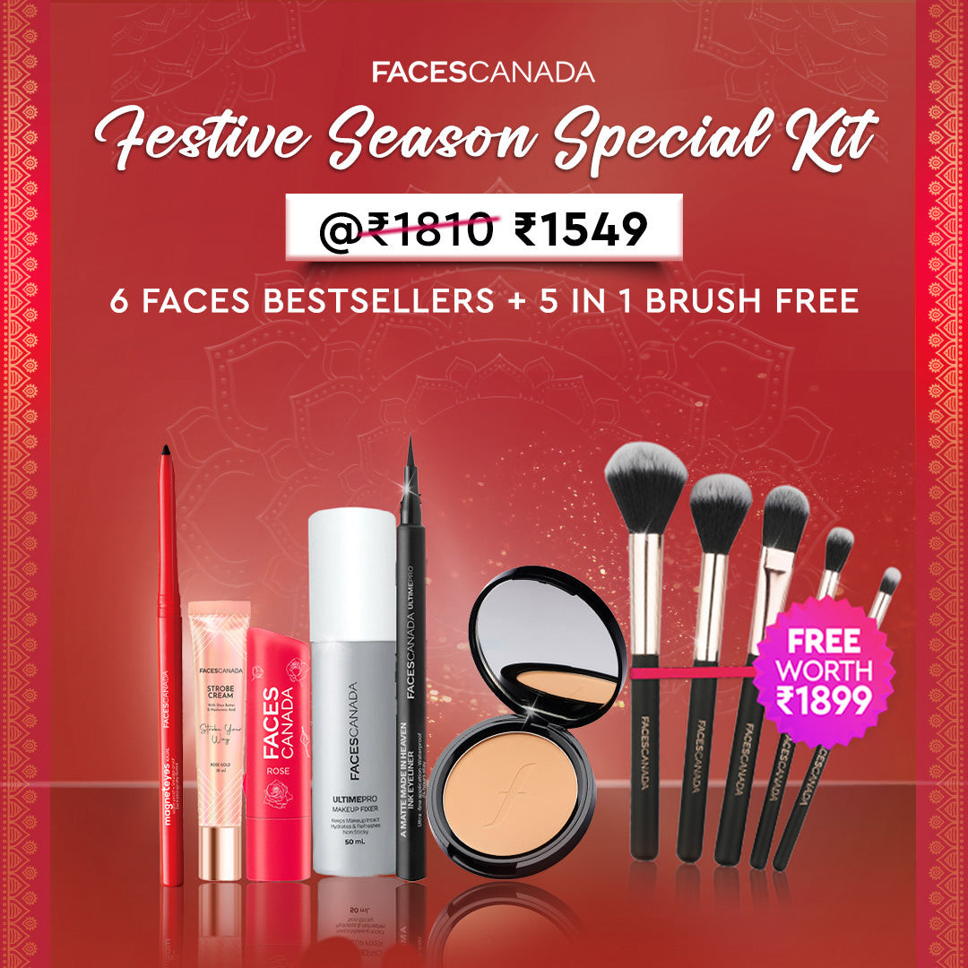 FACES CANADA Weightless Stay Matte Finish Compact Powder – Natural 02 (9 gm) provides a non-oily, SPF 20 matte finish that evens out complexion and prevents acne, while the Ultime Pro Makeup Fixer (50 ml) locks makeup in place, keeping skin hydrated, refreshed, and smudge-free all day. The Strobe Cream Mini – Rose Gold (18 gm) acts as a primer, highlighter, and moisturizer, delivering intense hydration and a radiant, dewy glow with Shea Butter and Hyaluronic Acid. The Color Lip Balm – Rose Petal 03 (4.5 gm) offers a red tint, 12-hour moisture, and SPF 15 protection while nourishing and softening lips. The Magneteyes Kajal – Black (0.35 g) ensures bold, smudge-proof eye definition for up to 24 hours, complemented by the Ultime Pro A Matte Made in Heaven Ink Eyeliner – Black (1.2 ml) with fine-tip precision, waterproof, smudge-proof, and transfer-proof formula for dramatic eyes. Completing the set, the 5-in-1 Makeup Brush provides a versatile, travel-friendly tool for flawless application of foundation, powder, blush, eyeshadow, and lips.