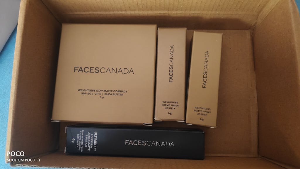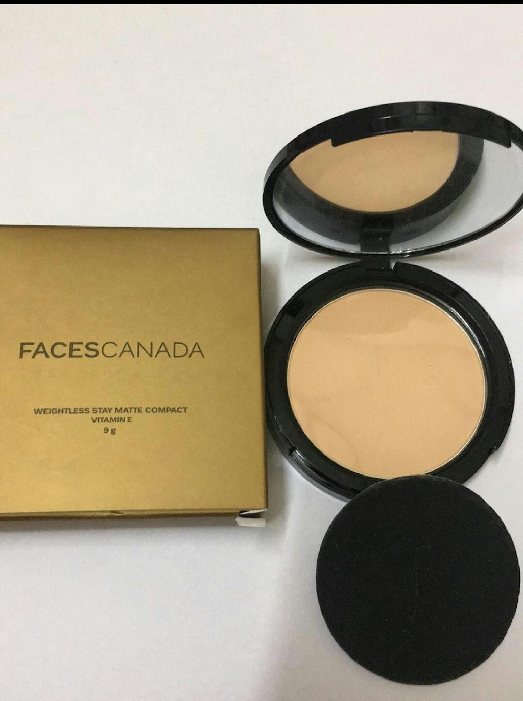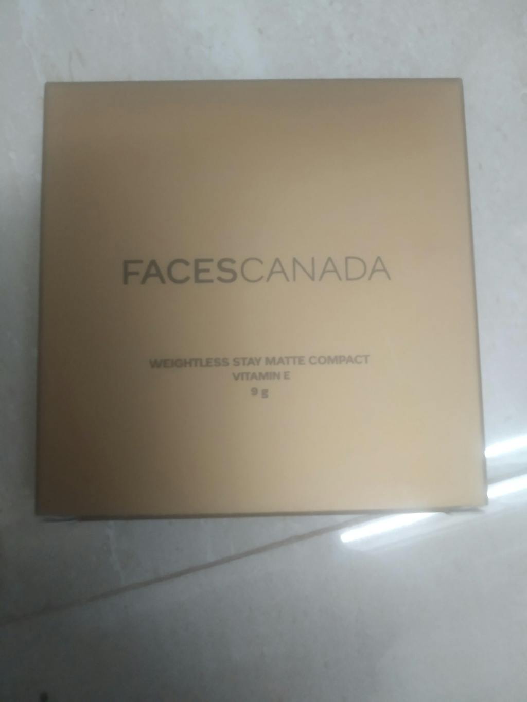 Faces Weightless Stay Matte Compact packed in a glossy golden colored square cardboard package with all the crucial information associated with the product printed on the back of the box & its brand and range name written on the front.